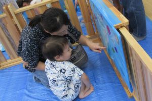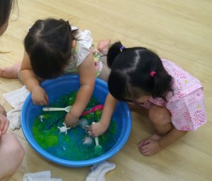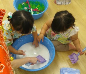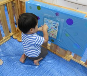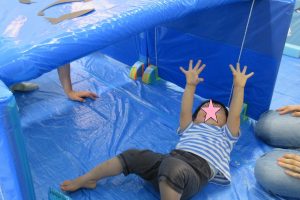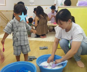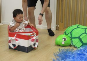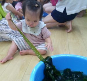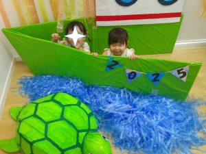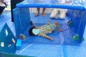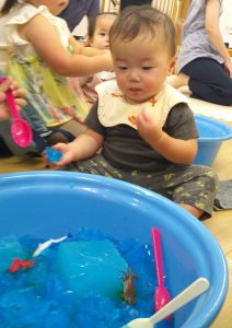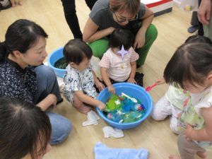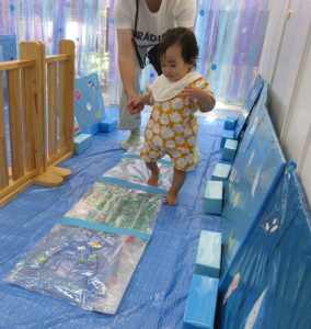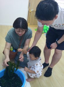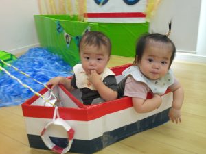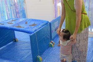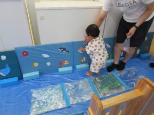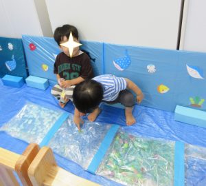 小さな船に乗ったり、感触遊び(片栗粉・寒天・ワカメ)もできるよ🤩