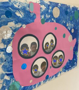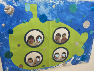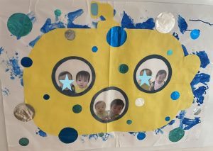 2階に行く階段の壁には潜水艦に乗ったお友だちがいるよ🛥️